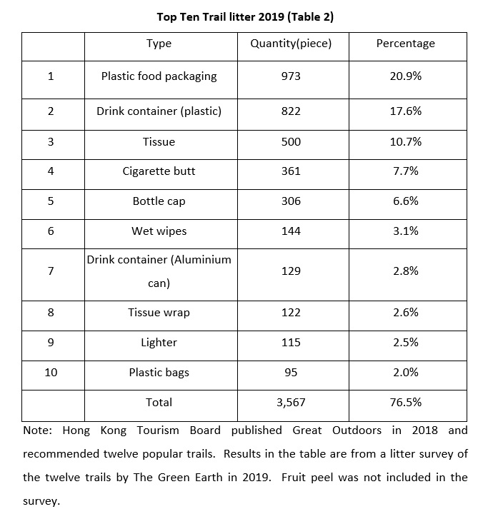 (4th April 2022 Press Release) Green Hero Challenge, a trail of litter survey, by The Green Earth (TGE) revealed the makeup of almost 15,000 pieces of litter collected from the hiking trails. Tissues and cigarette butts accounted for the most of the collection with 21% each. Food packaging, 20% of the collection, ranked second. The amount of the tissue group including wet wipes and tissue packaging, with a total of 4,592 pieces, accounted for 32% of the collected litter (Table 1).