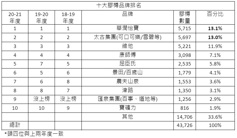至於繁體品牌排名,頭四位連續三個年度保持不變,分別為維他 (29.1%)、太古集團 (24.2%)、屈臣氏 (14.2%)及津路(7.6%),而前三大牌子的膠樽量,佔總量的67.5%。