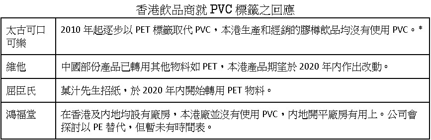 無毒先鋒則表示,國際飲品企業堅守其全球承諾,確保在中國市場不再使用 PVC 材質標籤以及其他任何有毒化學品。而康師傅、怡寶等中國飲品業的龍頭企業,更應效法先進,率先作出淘汰 PVC 的承諾,為内地其他同行做好榜樣。