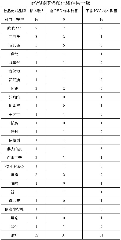 這 62 個樣本中,來自香港、北京及廣東的各佔 28 個、10 個和 24 個。在 28 個本地樣本中,13 個( 即 46%) 使用PVC標籤,包括維他、屈臣氏、道地、鴻福堂、葡萄適等公眾熟悉的牌子。而在內地檢測的多款中國及國際飲品亦榜有上名,例如怡寶、康師傅、農夫山泉、寶礦力、百事、達能等,部分亦有在香港銷售。