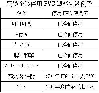 台灣自 2005 年已明定飲品膠樽使用 PVC 時,業者須額外承擔回收處理費,此舉令PVC用量大減。2017 年 PVC 塑膠容器用量,更僅佔總塑膠容器用量的 0.29%。即使如此,台灣環保部門今年7月起更提高收費4.7倍,由現行的每公斤 18.5 元台幣( 約 4.6 港元) ,調升至 87 元台幣( 約 22 港元) ,進一步促使業界減量。南韓環境部更宣布,12 月 25 日起禁止飲品樽等包裝物料用上 PVC。