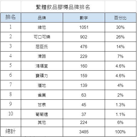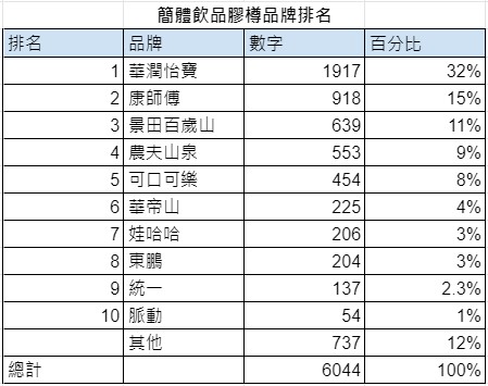 若以繁體字品牌區分,維他、可口可樂、屈臣氏本地三大品牌的廢膠樽,佔據70%的膠樽量。簡體品牌排名上,頭五位的華潤怡寶、康師傅、景田百歲山、農夫山泉、可口可樂共佔總棄置量的75%。