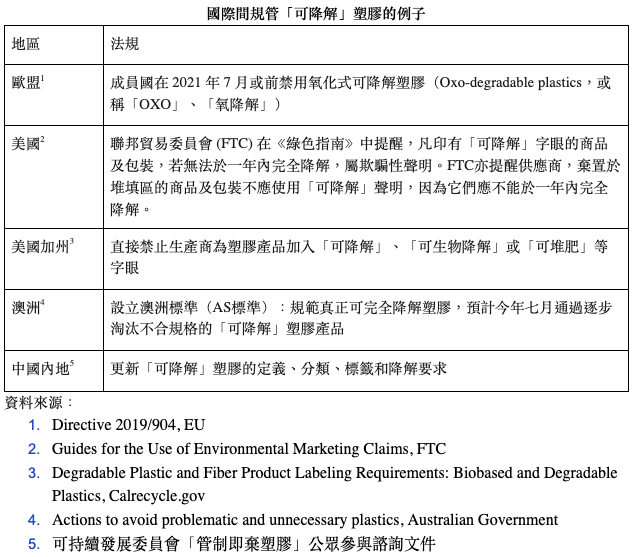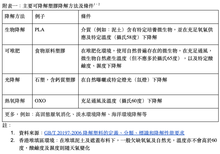 他又指出,可持續發展委員會去年完成了即棄塑膠公眾參與,當中有探討管制「可降解」塑膠的範疇。他呼籲「委員會不該接受現時『無王管』的狀態,應要求政府盡早訂定規管『可降解』塑膠的標準、確立相關收集系統及處理設施。」