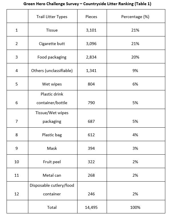 (4th April 2022 Press Release) Green Hero Challenge, a trail of litter survey, by The Green Earth (TGE) revealed the makeup of almost 15,000 pieces of litter collected from the hiking trails. Tissues and cigarette butts accounted for the most of the collection with 21% each. Food packaging, 20% of the collection, ranked second. The amount of the tissue group including wet wipes and tissue packaging, with a total of 4,592 pieces, accounted for 32% of the collected litter (Table 1).