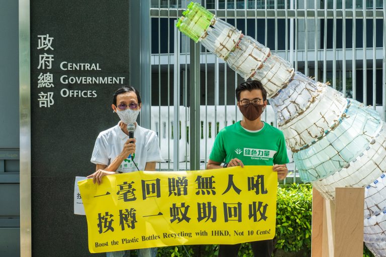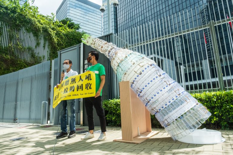 交流會前,多個環團代表在會場外豎起由279個飲品膠樽砌成的大型膠樽裝置,喻意香港膠樽圍城與回收不濟的窘境,藉此促請署方落實相關的生產者責任法規時,應採納國際行之有限的按樽制,按樽金額至少一元。