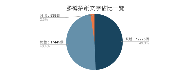 這次調查共收集到破紀錄的43,726個廢膠樽,當中除7,668個無法識別品牌外,餘下36,058個瓶子中,繁體、簡體及其他文字的膠樽各佔49.3% 、48.4% 及2.3%,前兩者平分秋色。
